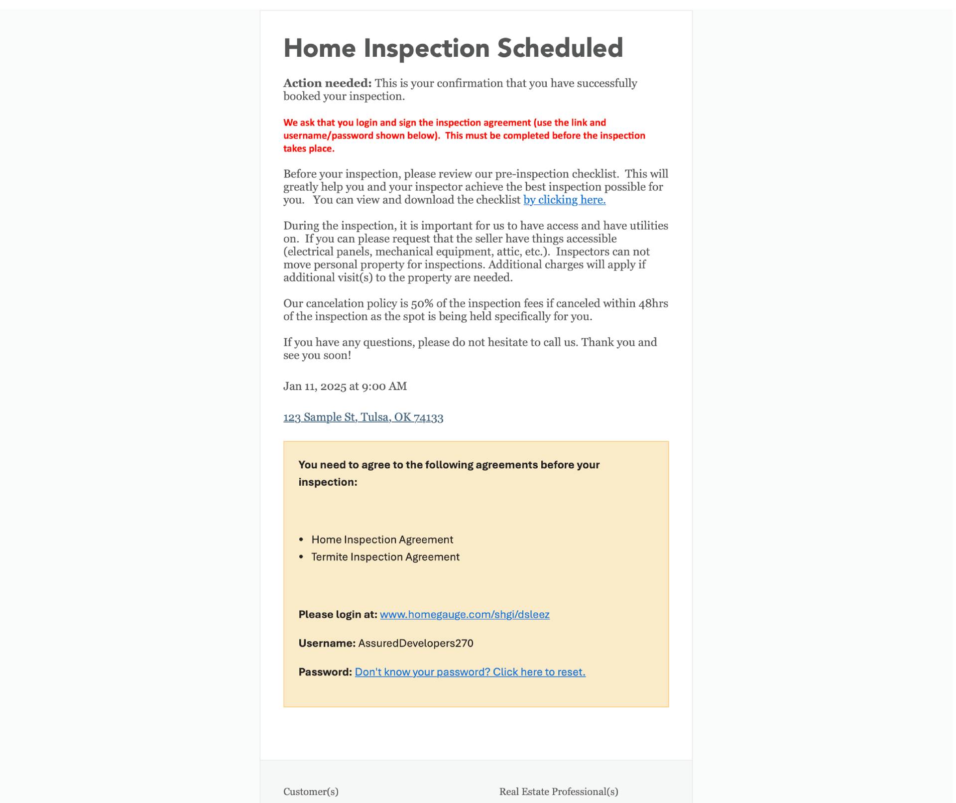 - Refer to Your Booking Confirmation Email: Look for the confirmation email from Assured Home Inspectors. Inside, you’ll find your login link and credentials.